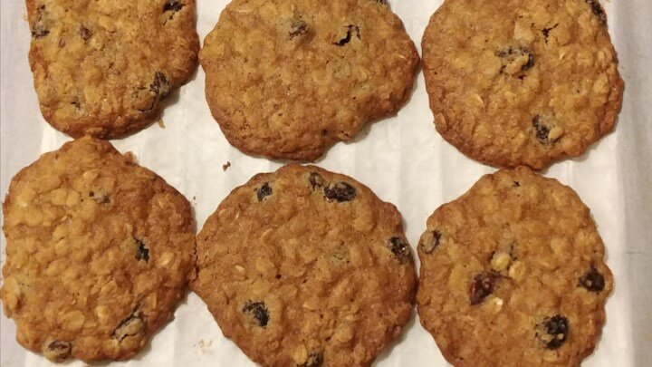 Старый рецепт, который любит вся семья. 1 ч., 48 порций Ингредиенты: 3/4 стакана сливочного масла, размягченного 3/4 стакана белого сахара 3/4 стакана фасованного светло-коричневого сахара 2 яйца 1 ч. л. ванильного экстракта 1 1/4 стакана универсальной муки 1 ч. л. пищевой соды 3/4 чайной ложки молотая корица 1/2 чайной ложки соли 2 3/4 чашки овса 1 чашка изюма Приготовление: Разогрейте духовку до 190 градусов C. В большой миске смешайте сливочное масло, белый сахар и коричневый сахар до однородной массы. Хорошо взбейте яйца с ванилью до образования пены. Смешайте муку, пищевую соду, корицу и соль. Постепенно вмешайте все в масляную смесь. Добавьте овес с изюмом и перемешайте. Выложите чайной ложкой на несмазанный противень. Выпекайте 8-10 минут в разогретой духовке или до золотистого цвета. Охладите немножко, перехожите с противня на решетку и полностью охладите. В одной порции: 92 ккал; 3.4 г жира; 14.6 г углеводов; 1.3 г белка; 15 мг холестерина, 75 мг натрия.