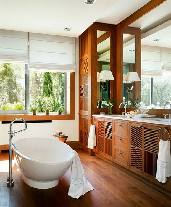 Эта просторная ванная комната с отделкой из дерева – хороший образец современного интерьера.