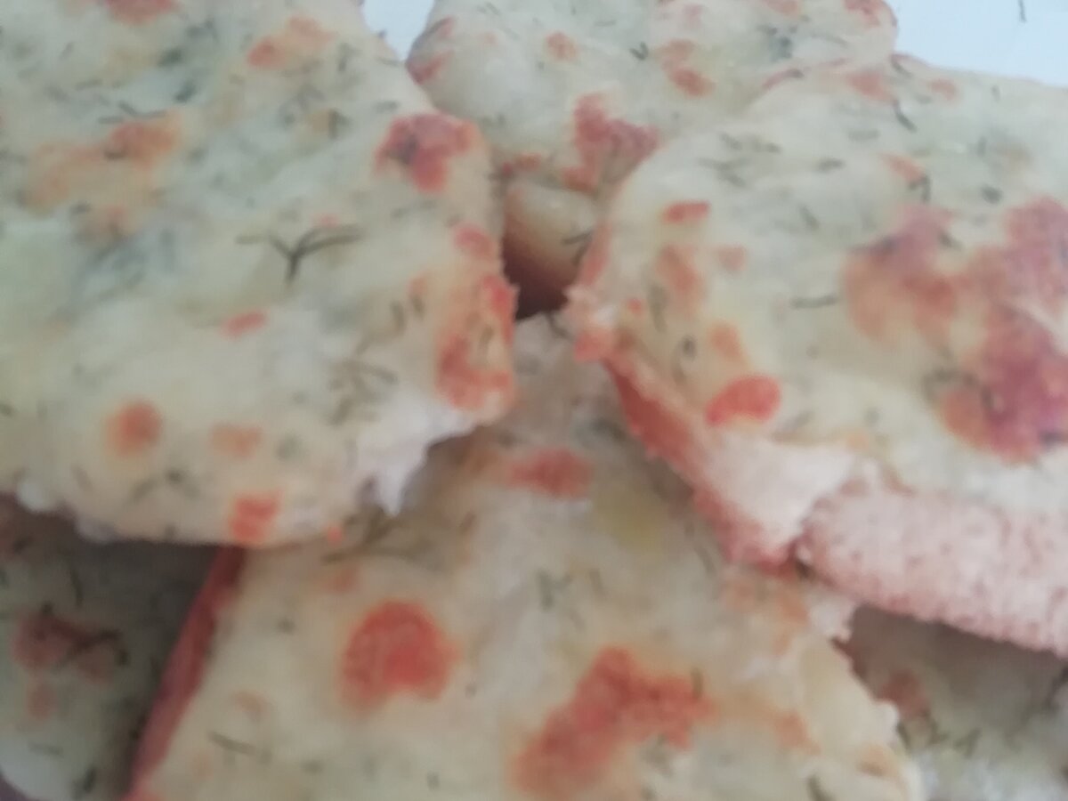 Теперь берем кусочки батона и наносим на них картофельную смесь.