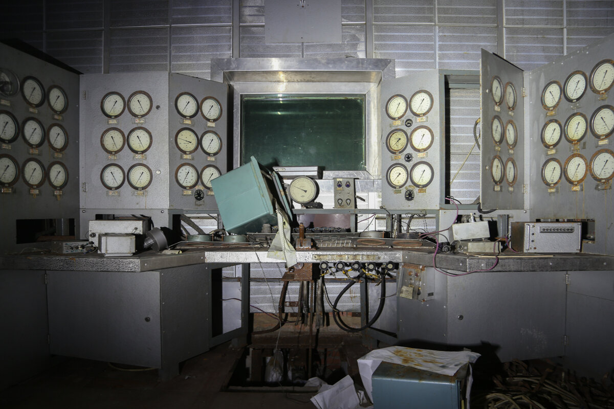 В одну из ночей мне и моему напарнику не спалось. И вот мы решили немного пройтись. Место прогулок было выбрано случайно и ничто не предвещало неожиданного и интересного приключения. Стоит немного рассказать о том, где мы сейчас будем находится. Это место комплекс зданий, где происходят испытания авиационных двигателей боевых самолетов. Точнее судя по виду, они там происходили и достаточно давно. За неделю такой дикий хаос сложно создать, даже при наличии таланта. На фото снизу мы видим пульт, за которым проводились различные испытания и исследования, а также записывались полученные данные. На следующем фото большая комната, для чего она предназначена, я и мой коллега не смогли понять. Слишком много всего сломано и вынесено. Возможно тоже комната для наблюдения за испытаниями. Наверное, самое целое, что там есть сейчас это деревянный стул. Наверное, конструкторам и авиастроителям стоит взять это на заметку. Все железо искорежено, а стул как стоял, так и стоит. Только пыль немного о