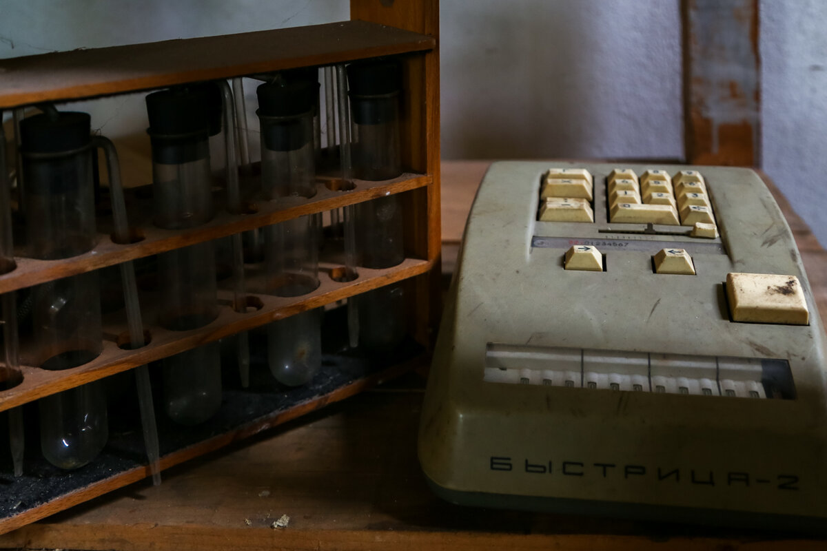 Заходим во внутрь, а тут просто ассортимент хлама, но для меня все это просто непонятные приборы. На одной из полок, стоял вот такой аппарат и рядом пробирки на подставке.