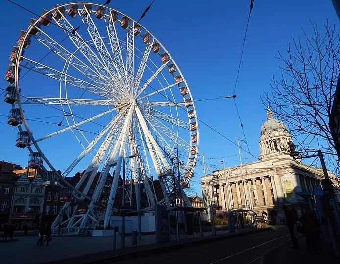 Выходишь из замка видишь колесо обозрения - это Old market square.