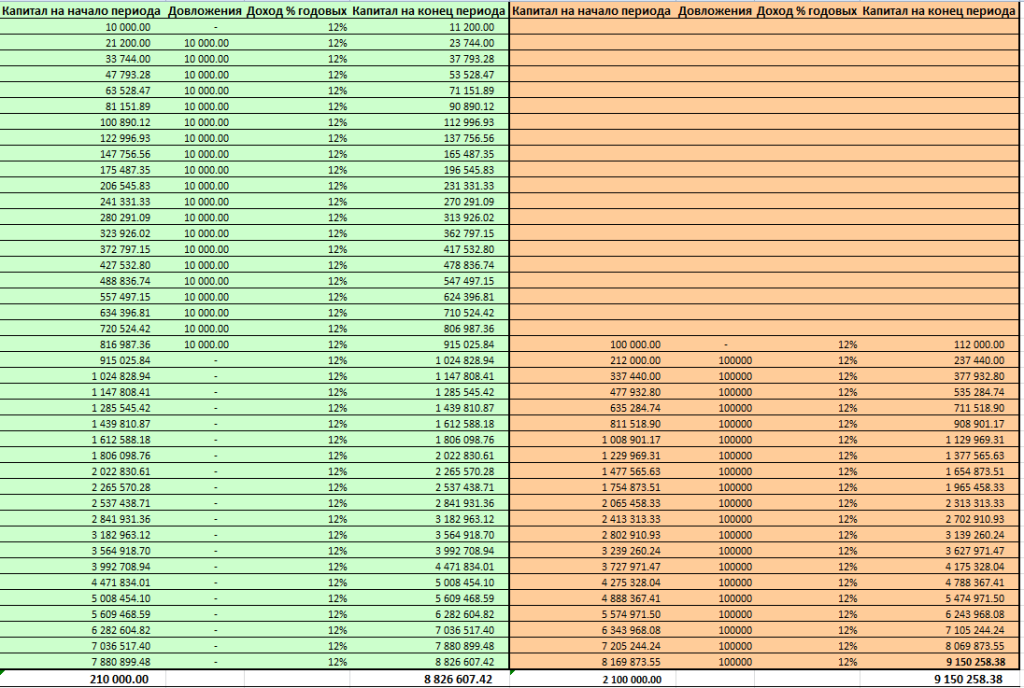 Кто же помогает инвестору в его нелегком деле инвестирования? Возьмем для примера двух человек. Первый в возрасте 20 лет начал откладывать по 10 000 в год и инвестировать их под 12% в год на протяжении 20 лет. В 40 лет он прекратил откладывать деньги, но инвестированные средства не тратил. Второй человек до 40 лет тратил все, что зарабатывал, и внезапно осознав, что старость подкрадывается незаметно, стал откладывать по 100 000 в год и инвестировать их под такой же процент на протяжении 20 лет. Что в итоге получилось? К 60 годам первый человек будет иметь 8 826 607 на счету, второй — 9 150 258. Казалось бы у второго денег больше (на 323 651), но давайте посмотрим на это с другой стороны: первый человек за все время инвестировал всего 210 000, а второй — 2 100 000! Разница в 10 раз! Благодаря чему такая разница в сумме вложений приводит к почти одинаковым результатам в итоге? Благодаря двум главным друзьям инвестора: времени и сложному проценту. Первый человек начал инвес