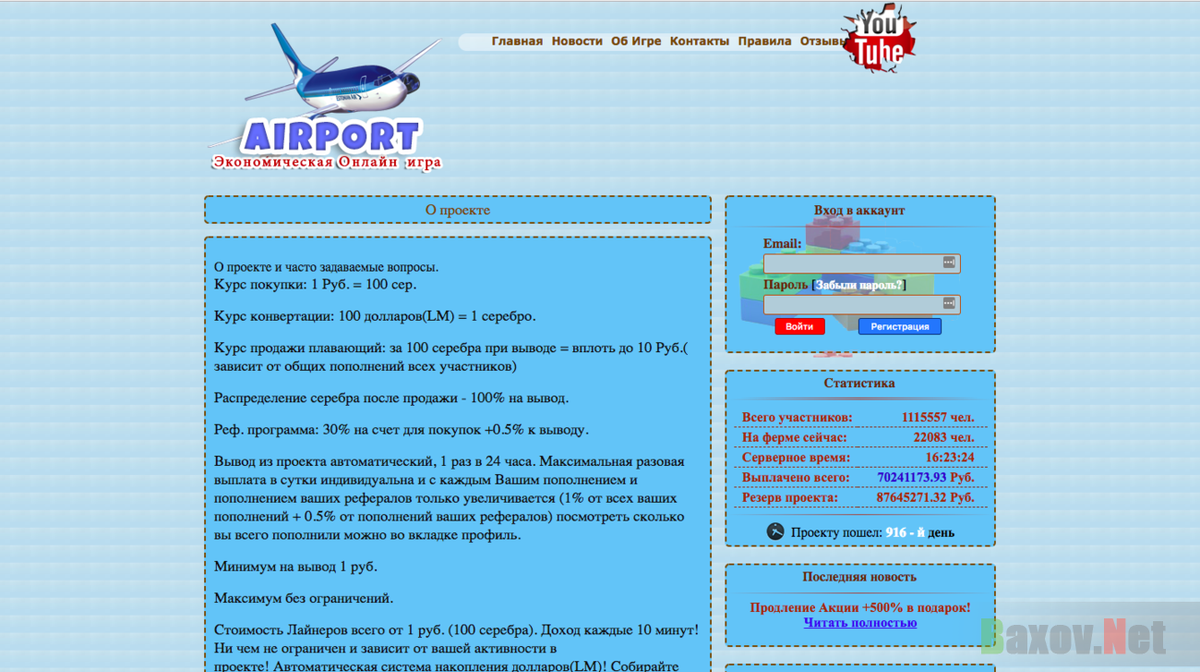 Кто же не мечтал о собственно аэропорте, который будет приносить прибыль. И осуществить свою мечту можно с помощью новой экономической игры Airport, которая предоставляет такую возможность. Но это лишь громкие слова, поскольку в действительности, для создания собственного аэропорта в игре и получения прибыли нужно вложить деньги, но обратно вы их уже не получите. Известные названия проекта Ссылки на сайт проекта E-mail адреса проекта Внимание! мошенники очень часто меняют адреса своих лохотронов. Поэтому название, адрес сайта или email может быть другим! Если Вы не нашли в списке нужный адрес, но лохотрон очень похож на описанный, пожалуйста свяжитесь с нами или напишите об этом в комментариях! Информация о проекте "Airport" Это новая экономическая онлайн игра, которая представляет возможность создать собственный аэропорт и получать с него прибыль. Игра предоставляет внутреннюю валюту – доллары, которые приносят самолеты за время своей работы. В последствии их можно обменять на сере