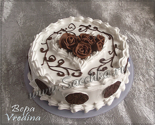 - Покрыть верх и бока торта взбитыми сливками. Из кондитерского мешка отсадить "бордюр".