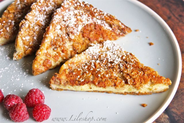5. Ставим разогреваться сковороду на плиту и включаем средний-низкий огонь. Обмакиваем каждый кусочек хлеба по отдельности в яичной смеси, немного задерживая над миской, чтобы стекли излишки.