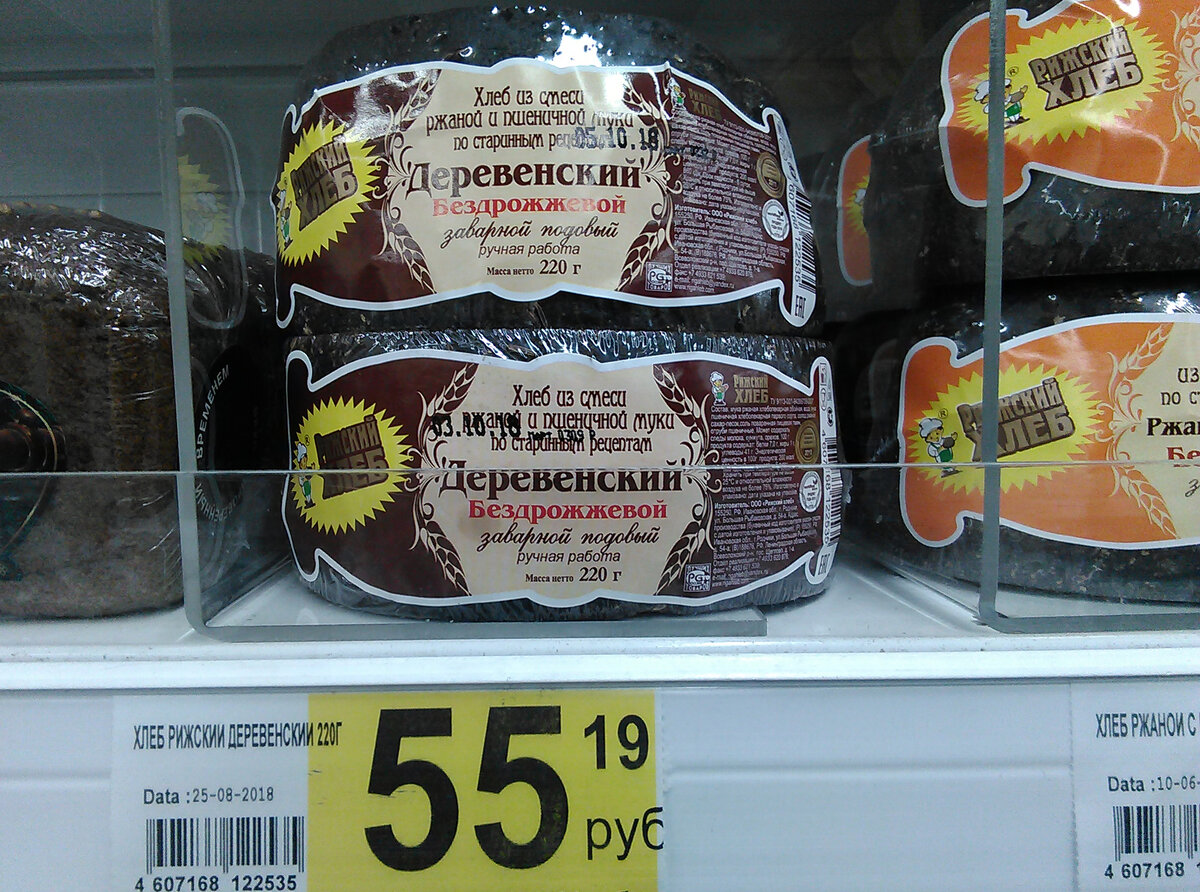 Хлеб является неотъемлемой частью ежедневного рациона питания практически каждого человека. Существует много споров и дискуссий на тему о пользе и вреде употребления хлеба. Но я не буду касаться этого вопроса, а сделаю обзор и выскажу свое мнение. Хлеб я употребляю в пищу не часто, можно сказать под настроение. Ассортимент хлеба на сегодняшний день просто огромен. Выбирай, на любой вкус и кошелек. Сегодняшний обзор на хлеб "Деревенский" бездрожжевой, от производителя "Рижский хлеб". Данный хлеб я покупаю достаточно давно. Уже даже и не помню, когда попробовал его в первый раз. В Ашане упаковка массой 220 грамм стоит 55 рублей, что в пересчете на 1 килограмм составляет 250 рублей. А на сегодняшний день за 250 рублей можно купить примерно 2,5 кг курицы (тушка) или 1 кг свинины. Так что цена за этот хлеб действительно не маленькая. Упаковка представляет из себя плотно натянутую полиэтиленовую пленку. Состав: мука ржаная хлебопекарная обойная, вода, мука пшеничная хлебопекарная перво