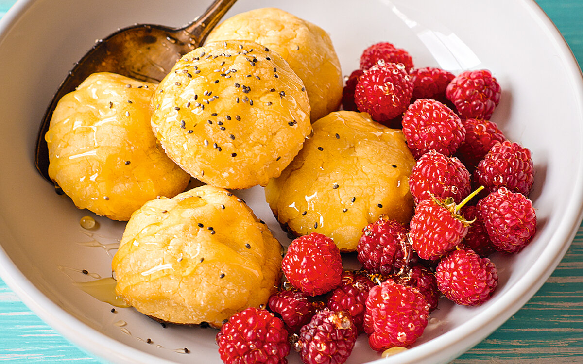 Мята свежая — 2 веточки Приготовление 1️⃣ Творог комнатной температуры взбить миксером, смешать с яйцом комнатной же температуры. Добавить сахарный песок, соль, муку и вымешивать до однородной густой массы. 2️⃣ Раскатать массу в шарики размером c грецкий орех, панировать в кукурузном крахмале и выложить на противень с пергаментом. Полить шарики растопленным маслом и отправить в разогретую до 220 °C духовку на 3—5 минут. 3️⃣ Часть сметаны тщательно перемешать с медом. Затем добавить оставшуюся сметану, соль, семена чиа и несколько листочков мяты.