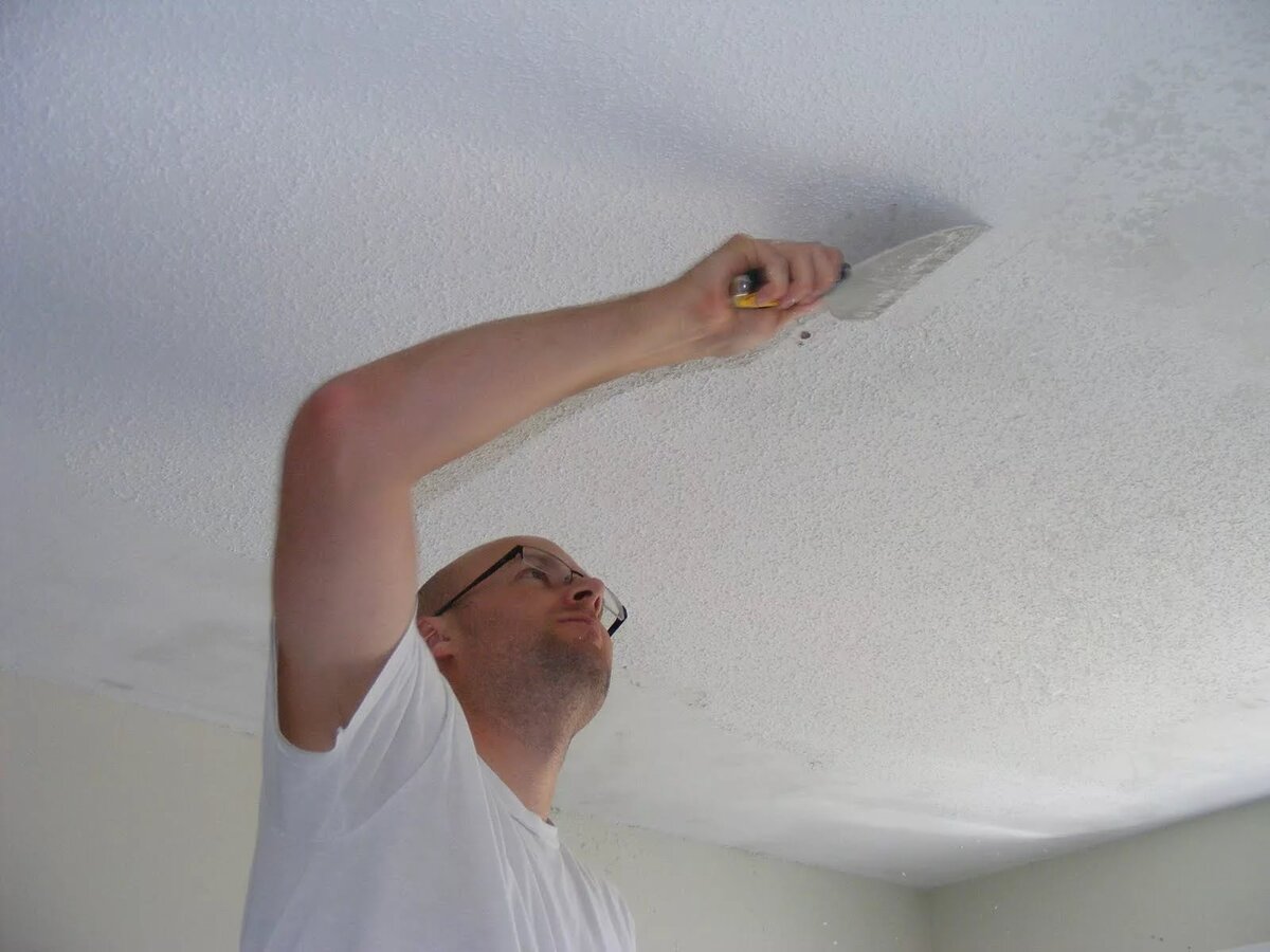 • Освободите комнату, в которой будут проводиться ремонтные работы, от лишней мебели. То, что не удалось убрать, накройте пленкой. Полы тоже следует накрыть защитным материалом. • Налейте в ведро с широким верхом или в таз теплую воду. Возьмите валик с длинной ручкой. Ее длины должно быть достаточно для того, чтобы, стоя на полу, дотягиваться валиком до потолка. Берите валик, смачивайте его в воде и наносите ее на потолок. Его надо очень хорошо п