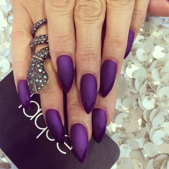 Фиолетовый - это смесь сумасшедшего, бешеного красного и спокойного, безмятежного синего. Это цвет, обычно ассоциируется с роскошью, властью и амбициями. Также, фиолетовый может быть довольно загадочным и неповторимым! Если какое-либо из этих слов относится к вам, то вы должны определенно сделать фиолетовый маникюр! Мы собрали лучшие 32 идеи фиолетовых ногтей с разных сайтов и модных блогов, которые вы можете использовать в качестве вдохновения для своего следующего фиолетового маникюра. Если вам нужен маникюр, который заставит вас чувствовать себя сильной, эффектной, роскошной - листай ниже! Простые идеи фиолетовых ногтей Эти фиолетовые акриловые ногти просты. Просто выберите любимый оттенок фиолетового, накрасьте ногти, и вы будете королевой этого дня. От светло-фиолетового до темно-фиолетового, от матового до глянцевого - мы нашли целый ряд интересных и уникальных оттенков для вашего быстрого и легкого нейл-арта. Эти металлические идеи могут казаться сложными из-за их блеска, но