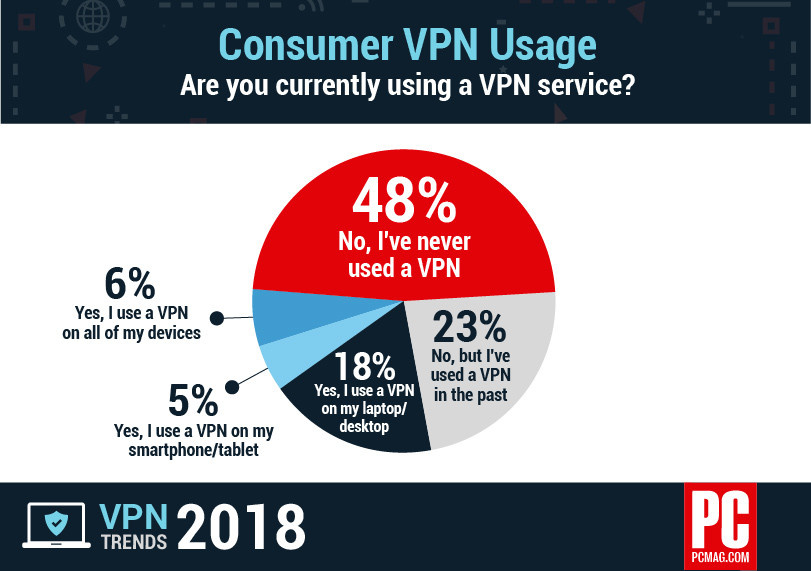 Новое исследование PCMag показывает, что большинство людей знает, как VPN может помочь им оставаться в безопасности в Интернете, но не использует его. 48% респондентов заявили, что никогда не использовали VPN, а 23% использовали, но больше не делают этого. В недавнем опросе 3000 американских потребителей, проведенном PCMag с 23 по 26 сентября, более половины респондентов (52%) заявили, что нуждаются или будут нуждаться в VPN для целей безопасности. Тем не менее, 48% заявили, что никогда не использовали VPN, а 23% - использовали в прошлом, но не делают этого сейчас. Только 29% (почти каждый третий опрошенный) сказали, что действительно используют VPN. 18% используют VPN на ноутбуке или компьютере, только 5% - на смартфоне или планшете. 6% используют VPN на всех своих устройствах. Примечательно, что опрос также показал, что использование VPN увеличилось со времени апрельского отказа от "правил нейтралитета" в эпоху Обамы, что мешало провайдерам, например, замедлять или блокировать служ