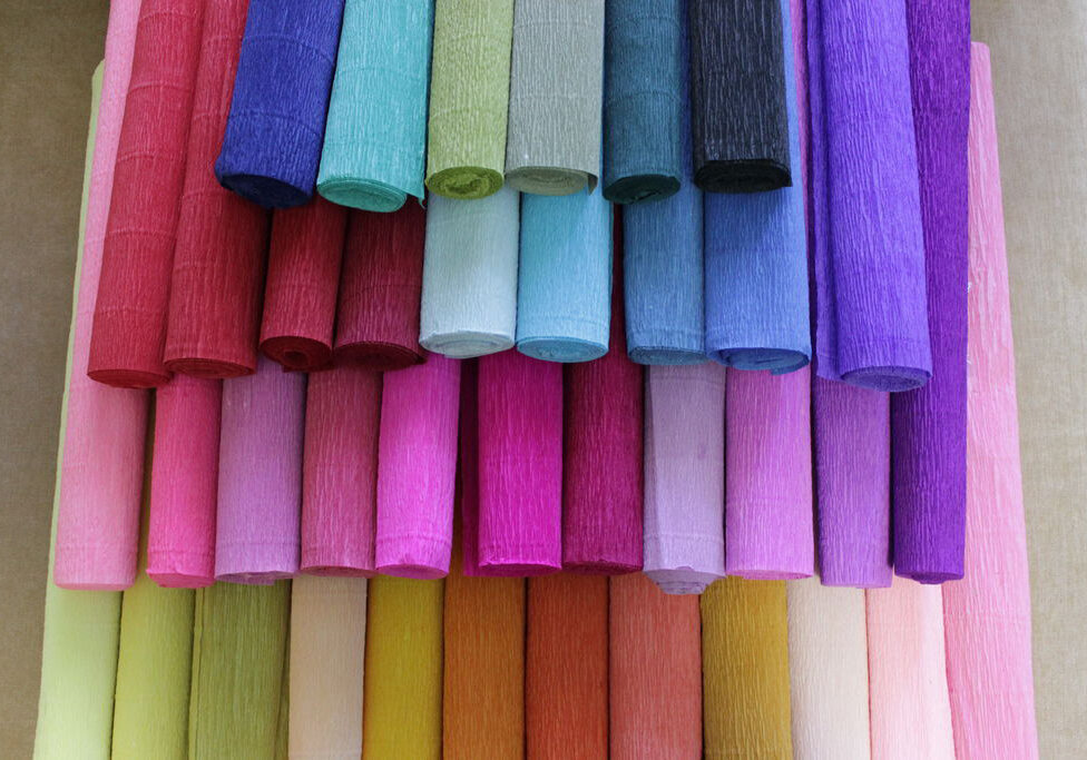 Даже золото и серебро. Есть интересные радужные оттенки с переходом цвета Итальянская бумага имеет ряд преимуществ по сравнению с китайской и обычной бумагой для детского творчества. Самое главное это то, что она плотнее и намного лучше тянется. Для сравнения на фото показано на сколько тянутся разные виды гофрированной бумаги. Сверху итальянская, по середине китайская, снизу для детского творчества. Китайскую гофрированную бумагу можно использовать для того, чтобы обернуть основу вашей композиции или ножки для цветов, э