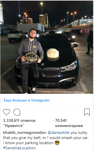 Хабиб Нурмагомедов столкнулся с возможным штрафом и приостановкой, а также зарплату в размере 2 миллионов долларов, удерживаемую Атлетической комиссией штата Невада, за его "выступление" вне октагона в UFC 229 в субботу, но по крайней мере он сохраняет своё чувство юмора? Чемпион UFC в легком весе в своём Instagram,пытался высмеять президента UFC Дана Уайта за то, какие последствия столкнулся бы Дан Уайт , если бы он снял с Нурмагомедова его пояс . @danawhite вам повезло, что вы отдали мой пояс, или я разбил бы ваш автомобиль, я знаю ваше место парковки. На фото BMW Дана Уайта, Хабиб может, вероятно, успокоиться, так как Дан Уайт сказал TMZ в понедельник, что Нурмагомедов «абсолютно» не будет лишен своего титула, хотя вскоре он может получить шестизначный штраф. Если это единственное наказание, которое Нурмагомедов получает, некоторые подумают что такое наказание слишком мягкое, а другие могут подумать, что это слишком жестко для бойца, который вызвал абсолютный хаос посл