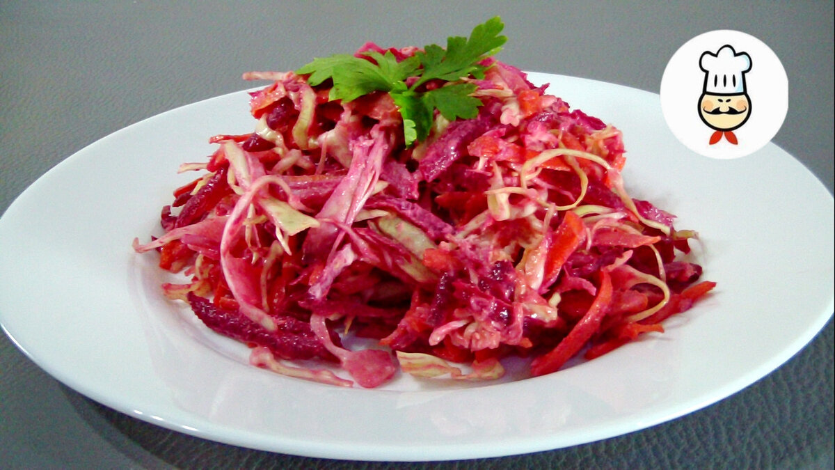 Попробуйте вкусный и полезный салат, который приготовить вообще не составит труда. А полезность очень высока. К тому же он очень вкусный. . Ингредиенты: • Капуста – 150 г • Морковь (сырая) – 1 шт. • Свекла (сырая) – 1 шт. • Куриное филе (отварное) – 100 г • Майонез – 1 ст. л. • Кетчуп – 1 ст. л.