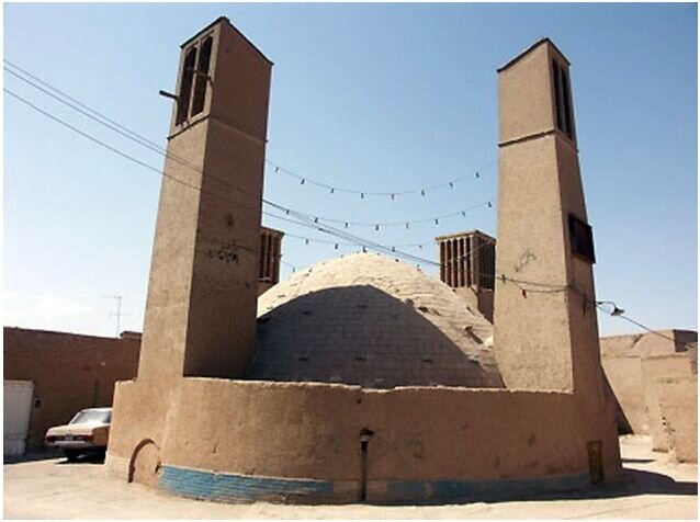 Более сложные системы были более основательны и сохранились и по наше время например в Иране.Через отверстия в верхней части колонны воздух попадает в воздуховоды и проходи мимо емкостей с водой охлаждался и попадал в помещения.