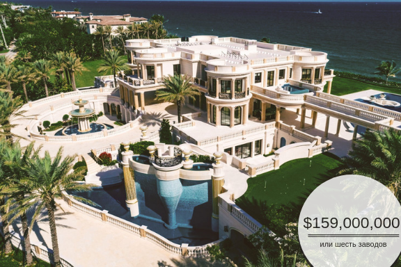 В этом ноябре в США пройдут торги одного из самых дорогих домов во Флориде — особняка Le Palais Royal. Его оценочная стоимость составляет $159,000,000. В 2015 году журнал SFBJ назвал особняк Le Palais Royal в Хилсборо-Бич — «долине нищих» штата Флориды в США — самым дорогим домиком в стране. Два года спустя Forbes поместил его в список 18 домов стоимостью более $100,000,000. В этом ноябре особняк отправляется на аукцион при оценочной стоимости в $159,000,000. Обычно мы приводим сравнения для лотов с примерами из российских реалий в конце статьи, но в этот раз нарушим традицию. Реконструкция порта Геленджика требует 9,5 миллиардов рублей. Le Palais Royal стоит на миллиард дороже. В Ставропольском крае сейчас строят два мясоперерабатывающих производства за 3,5 миллиарда рублей. Особняк из Флориды стоит в три раза дороже, то есть как шесть заводов. Бизнес-центр «Зенит» в Москве сейчас будут достраивать за 9,9 миллиардов рублей. Как вы понимаете, и это меньше стоимости роскошной усадьбы