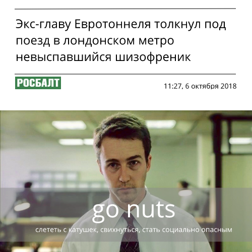 Go nuts – слететь с катушек, свихнуться, стать социально опасным Пример: It's too late to catch up on sleep when you already have gone nuts. Доказательства: РОСБАЛТ