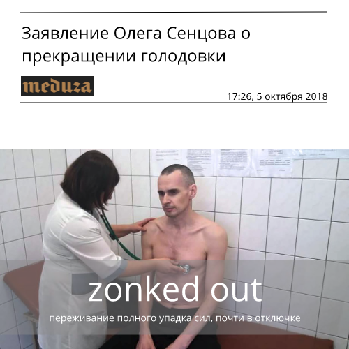 Zonked out – переживание полного упадка сил, почти в отключке. Пример: He has begun a hunger strike in protest over political violence and now he is completely zonked out. Доказательства: MEDUZA