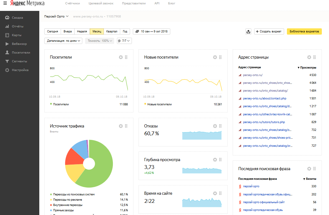 Инструмент очень обширен, дает огромное количество данных для анализа, и самое главное прост в применении. Как установить счетчик Яндекс Метрики подробно рассказано в соответствующей статье, а в данном материале, мы познакомим Вас с основными инструментами метрики на примере нашего нового Persey-Orto – производителя детской и взрослой ортопедической обуви. Производитель очень популярен, но сайт компании весьма неудобен. Наша студия занимается редизайном данного ресурса, поэтому нам будет интересно отследить на данном этапе поведение пользователей сайта.