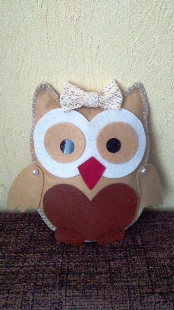 Совушка из фетра - милая мягкая игрушка, которая придется по душе не только малышу или малышке, но и ребенку постарше. Сшить игрушку очень просто и быстро даже вручную, потому что фетр - это материал, работать с которым легко и приятно! Для изготовления совушки потребуется мягкий фетр. Лучше, если он будет плотным, но толщина не слишком принципиальна. Материалы и инструменты: - шаблон совы - в 3-х экземплярах; - листы фетра нужного размера для тельца совы; - кусочки фетра нужных цветов для глаз, крыльев, животика, лапок и клюва; - пайетки черные большие для глаз - 2 шт.; - ленточка для бантика или готовый бантик (если сова-девочка); - ножницы; - маркер или простой карандаш; - нитки плотные; - швейная игла с широким ушком; - фиксирующие иглы; - термоклей; - материал для набивки (любой). Изготовление игрушки: 1. Шаблон совы нужного размера распечатать в 3-х экземплярах и вырезать по деталям, как на фото. 2. Перевести детали на фетр, вырезать: 2 детали для тельца, 2 совмещенных круга для