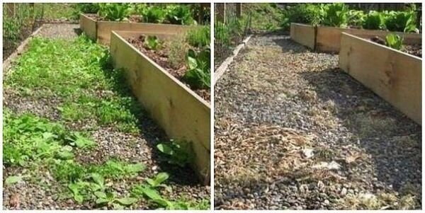 Чтобы уничтожить сорняки без гербицидов, используйте соль и уксус. Приготовьте раствор: 3 литра уксуса, 1/2 стакана соли, несколько капель любого жидкого моющего средства (чтобы капли раствора прилипали к сорнякам). Хорошо перемешайте. Эффективнее всего эта смесь работает в жаркий, солнечный день, когда дождя не ожидается, по крайней мере, в течение 24 часов. Опрыскайте сорняки утром, вечером вы уже порадуетесь результату. ВАЖНО: Это смесь убивает все растения, вступающие с ней в контакт, так что используйте с осторожностью. Еще она вымывает из почвы питательные вещества, поэтому предпочтительно ее использовать для таких мест, как подъездные пути, внутренние дворики, дорожки и т.д., там, где нет культурных посадок. Используйте для обработки сорняков 15-20% уксус. Для получения двадцати процентного уксуса добавляем к одной столовой ложке 70% уксусной кислоты две с половиной ложки воды.