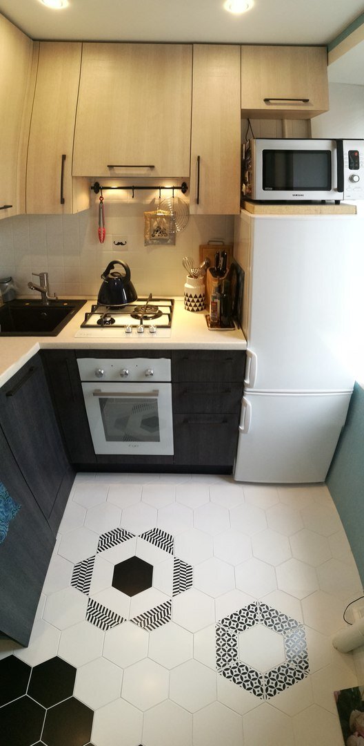 Очередное оригинальное решение проблемы размещения посудомоечной машины на маленькой кухне. И не только посудомойки. Как видно на фото, на кухне имеются: Размеры гарнитура 1950 мм по стороне, где стоит холодильник, и 1600 мм, где стоит посудомоечная машина. Расположение мебели и техники От окна Низ Глубина 60 см. Угол Глубина 45 см. Открывается посудомойка со стороны торца кухни. Верх Угол Обеденная зона Ее пока нет, но планируется, что маленький столик будет стоять в противоположном от холодильника углу. Плюсы данной кухни Минусы Но, если бы раковину перенесли чуть левее, то было бы тоже самое, но еще бы уменьшилась рабочая поверхность. Поэтому, наверное, данное размещение мебели и техники лучшее, которое могли придумать хозяева этой квартиры. Как вы считаете, лучше жить с посудомойкой и раковиной в углу или без посудомойки и раковиной, вынесенной ближе к краю? Или нужно было вынести из кухни холодильник? Напишите свое мнение! Жмите на палец вверх, если кухня вам понравилась! Под