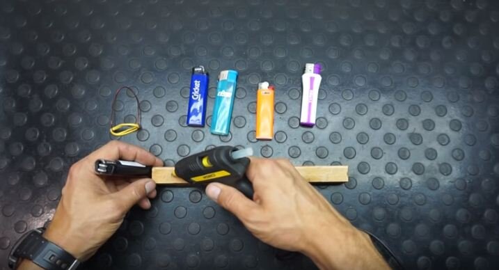 Для теста мы отобрали зажигалки нескольких фирм. Это Cricket, Clipper, Bic, Lion и Turbo. Сначала необходимо их закрепить. Используем для этого обычный деревянный брусок и клей. Также на брусок продеваем проволочки с резинкой. Они нужна для того, чтобы зафиксировать кнопку выпуска газа на каждой зажигалке. Получился вот такой стенд для испытаний. Теперь поочередно зажигаем огонь и включаем таймер. Время пошло! Может показаться, что последняя зажигалка не горит. Но на самом деле это турбозажигалка, а огонь в ней почти незаметен. Прошло полторы минуты и первой сдалась именно турбозажигалка. Она расплавилась и кнопка соскочила с зажима. Прошло двадцать минут и еще две зажигалки потухли: Clipper и Lion Прошел час. Cricket почти потух, а Bic уверенно горит, хоть немного и расплавился. В итоге победителем стала зажигалка под маркой Bic, которая горела больше часа. Вот это результат!!! Подписывайтесь на канал и ставьте лайк!