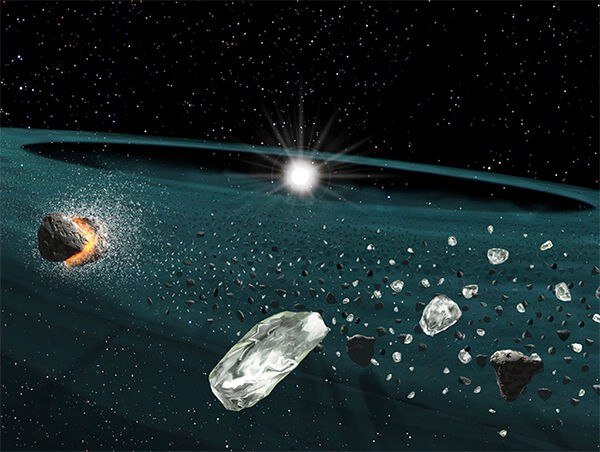 Со временем первоначальная газопылевая туманность превращается в диск; составляющие его очень мелкие частицы (пылинки и молекулы газа) обращаются вокруг центральной массы. Как же им удается объединиться в крупные планетные тела? Начинается с того, что пылевые частицы, плотность которых больше, чем у газа, под действием гравитации постепенно опускаются к центральной плоскости диска и там образуют очень тонкий субдиск, в котором частицы расположены достаточно близко друг к другу. Здесь опять начинает играть основную роль закон тяготения. Скорости частиц, находящихся рядом, почти одинаковые, а притяжение между ними существует. Они сближаются друг с другом с небольшой относительной скоростью, и их контакт заканчивается не взаимным ударом и дроблением, а всего лишь слипанием - получается большая масса. Когда за счет последующих слипаний эта масса вырастет до значительной величины, ей уже не страшны и более высокие скорости соударений: ее сила тяготения будет достаточной, чтобы удерживать ос