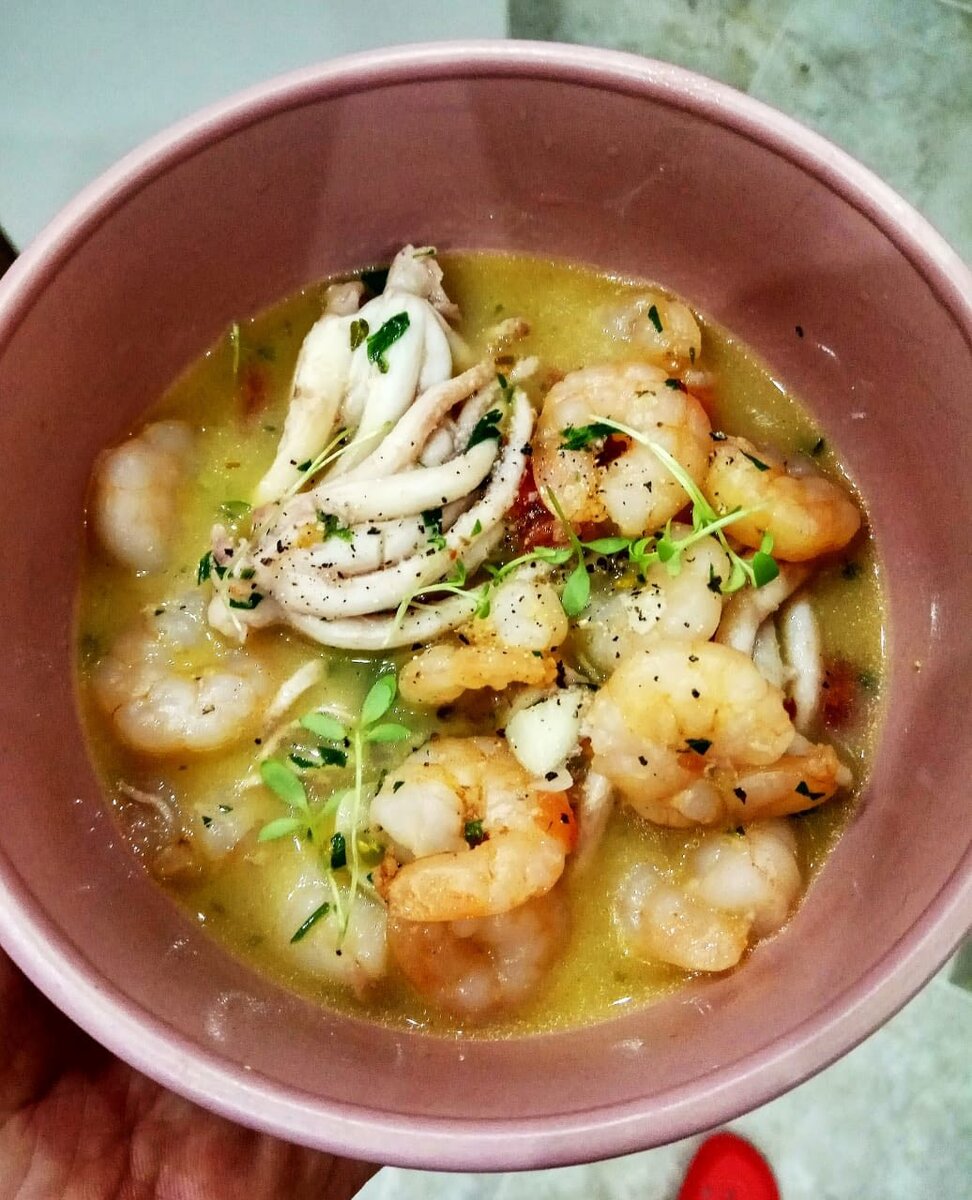 🥘Привет Друзья! Сегодня был отличный день с семьёй! Мы гуляли в парке и кормили уток. А вечером принимали гостей, я спек хлеб на закваске, сделал карпаччо из тунца, Брускетта с томатами и на горячее подавал соте из морепродуктов. А точнее из морских гадов! А именно из креветок и щупалец кальмара!