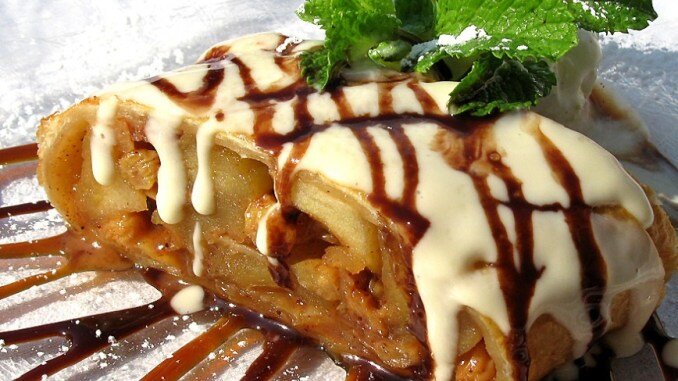 Штрудель – рецепт австрийской кухни, представляющий собой рулет из тонкого листового теста с фруктовой начинкой. Название блюда переводится с немецкого языка как «воронка, водоворот», так как при приготовлении штруделя тесто сворачивается в рулет. Первый штрудель с молочно-кремовой начинкой был приготовлен в Австрии в далеком 1696 году. Его рецепт даже хранится в библиотеке города Вены. В дальнейшем настоящее время классическим рецептом считается штрудель с начинкой из яблок, изюма и корицы, однако, не менее популярен вишневый штрудель. Приготовление штруделя может показаться на первый взгляд сложным, однако, если следовать подробному рецепту, можно легко испечь это вкусный десерт у себя дома. Для приготовления венского штруделя понадобятся: Приготовление: 1) Для начала необходимо просеять муку в емкость, добавить растительное масло, воду, щепотку соли и тщательно перемешать все ингредиенты. После того, как мука впитает жидкость, нужно посыпать мукой поверхность стола и замешивать те