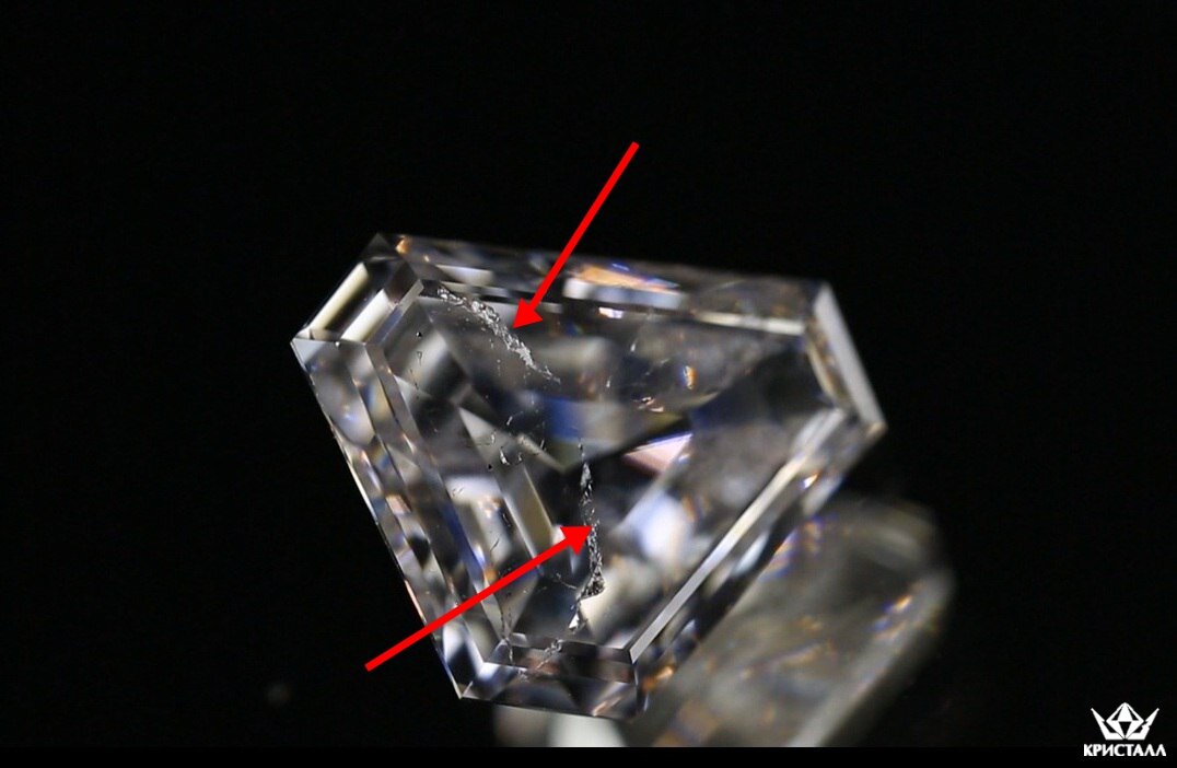 Они также встречаются и возле пояска бриллианта или под его рёбрами. Их можно легко заметить при просмотре грани драгоценного камня на границе «свет – тень» по тонким тёмным линиям на поверхности. Также существуют трещины, проходящие вдоль всей плоскости алмаза, их называют кливажными. Что делают специалисты? При разметке кристаллов с трещинами специалисты стараются быть очень аккуратными – обходить напряжённый участок стороной, то есть чертить линию разметки как можно дальше от подобных включений. Делается это для того, чтобы в дальнейшем, особенно это касается операции «распиливание», сократить риск раскола алмаза. В таких случаях применяют максимально щадящий режим обработки, чтобы нагрузка на драгоценный камень была минимальной. Как убирают трещины? При исследовании тре