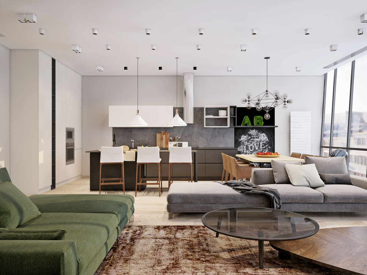 Интерьер квартиры с видом на Москву-реку в доме на Мосфильмовской 200 м^2