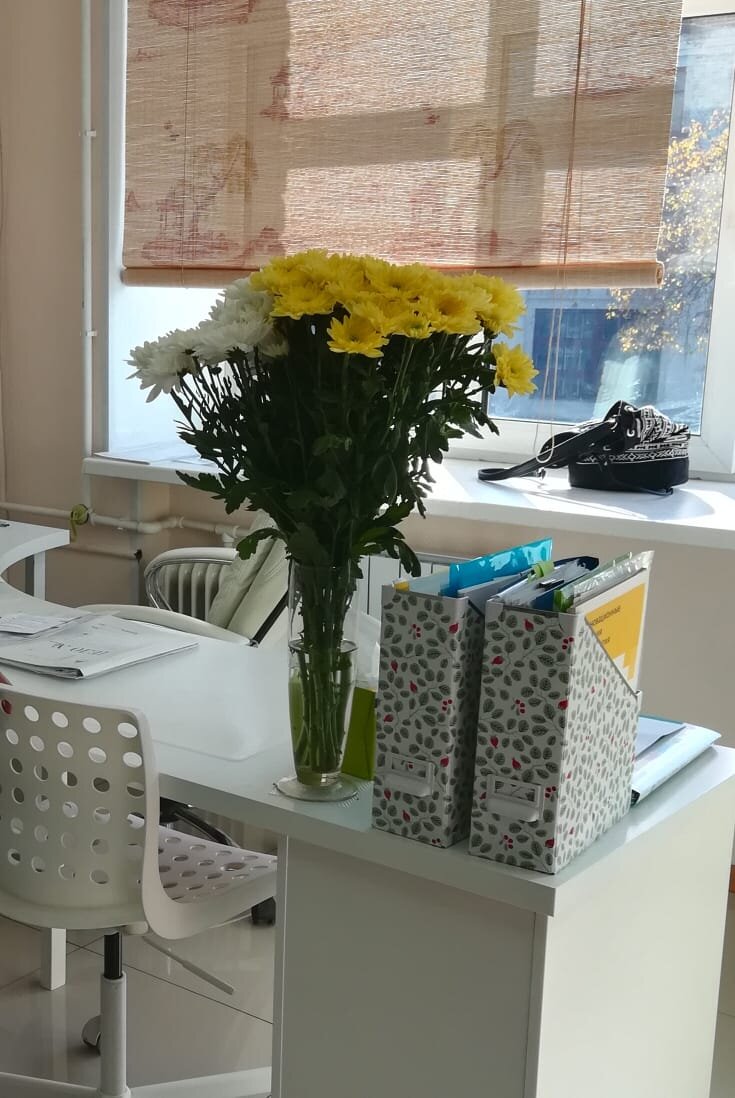 Обязательный атрибут? Каприз? Лишние затраты? На моем рабочем столе живые цветы круглый год. За много-много месяцев я настолько привыкла к этой вазе на перифирии зрения, что отсутствие букета на рабочем столе воспринимается драматично - весь офис сразу выглядит пустым и безжизненным... На свои вопросы в шапке я отвечу так: 1. Цветы в моем офисе атрибут обязательный однозначно! 2. Каприз? Ну, может быть, если это розы или еще какие-то экзотические цветочки)) 3. Затраты минимальные - в среднем 1000-1500 в месяц. Покупаем в основном хризантемы, т.к. живут они до 4 недель в вазе, а стоят недорого. "Капризы", как правило стОят дорого, а стоЯт недолго. Однако разнообразие необходимо, правда? Недавно в продаже появились светло-зеленые хризантемы. Букет белых и зеленых цветов идеально подходит к фирменной палитре. Желтый букет добавляет солнца и позитива в обстановку. Фиолетовый делает интерьер строже, деловитей что ли... А вы какой букет предпочли бы?