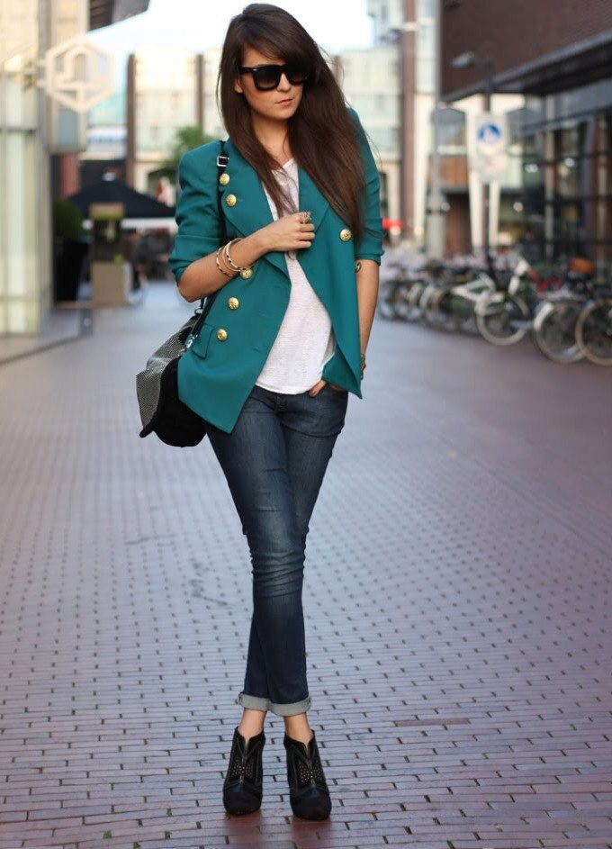 Пиджак давно перестал числиться среди официальных предметов гардероба. Еще пару десятилетий назад его нельзя было представить без строгих брюк или не менее строгой юбки в пару, а сегодня сочетание «пиджак-джинсы» стало привычным и обыденным. Как выгоднее подать эту пару, чтобы привлечь внимание и позволить оценить окружающим ваш вкус в одежде? Идеальное сочетание, само собой напрашивающееся для любого мероприятия, будь то встреча с друзьями или ежедневный поход в офис – классическая модель пиджака и такие же джинсы. Классика уместна и подходит для любого типа женской фигуры 1. Темный пиджак с синими или черными джинсами классического кроя позволительны на рабочем месте (если нет строго дресс-кода), в таком виде можно появиться на спектакле молодежного театра или театральном форуме (но не в Большом или театре оперы и балета!). Под пиджак, по ситуации и погоде, можно надеть футболку, гольф, рубашку, причем, как однотонную, так и цветную; 2. Светлый пиджак. К темному низу подойдет