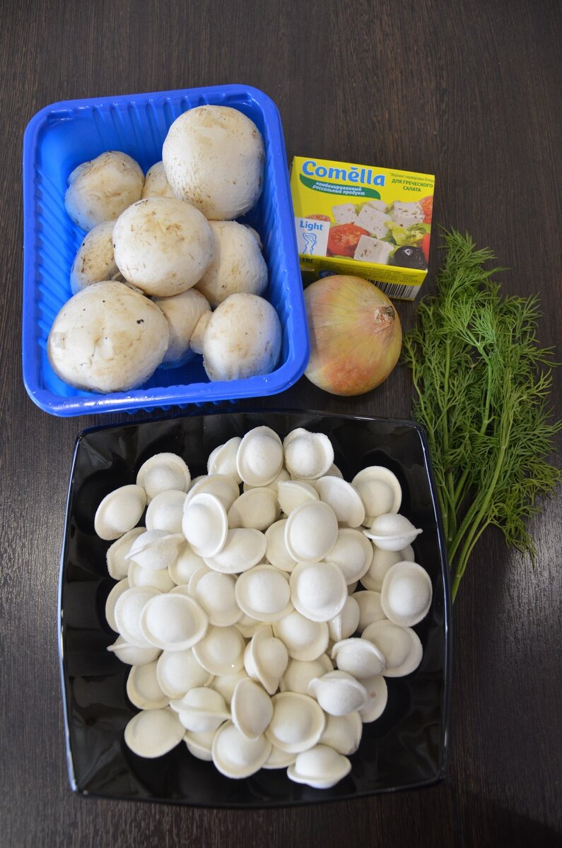 Предлагаю Вам приготовить это ароматное и очень сытное блюдо. Пельменное тесто напитывается вкусом грибочков и сыра в дополнении с мясной начинкой, результат вкусовых ощущений Вас приятно порадует. Ингредиенты: • пельмени замороженные 350-400 гр. • шампиньоны свежие 300 гр. • лук репчатый 1 шт. • сыр Comella 100 гр. • сыр твердый 100 г • сметана 2 ст. л. • зелень для подачи • любимые специи • соль, перец по вкусу • растительное масло Время приготовления: 40 мин. Порции: 3-4 Способ приготовления: 1. Ставим греться воду для пельменей. Пока греется вода, подготавливаем ингредиенты. 2. Лук режем кубиком или полукольцами и обжариваем на растительном масле до прозрачности. 3. Шампиньоны режем пластинками и добавляем к луку. Обжариваем все вместе до румяности (минут 5). К концу обжаривания немного солим и перчим. 4. Перекладываем шампиньоны с луком в горшочек. Сверху выкладываем замороженные пельмени. 5
