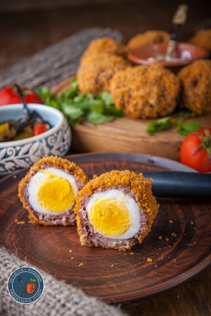 Здравствуй, честной народ. Хочу познакомить вас с рецептом из поваренной книги хоббитской кухни "The Shire Cookbook". Это многим известные и любимые так называемые "Яйца по-шотландски", "Scoth eggs" - блюдо дико популярное в мире за вкус, простоту приготовления и "удобность"- такие яйца сподручно брать с собой на перекус куда угодно. Они одинаково хорошо идут как в горячем, так и в холодном виде. Ингредиенты: 8 куриных яиц, сваренных вкрутую мука со щепоткой соли и перца. 500 г фарша. (по желанию говяжьего или в смеси со свиным) 1 яйцо (разболтанное с 1 ст.л. воды) панировочные сухари масло для жарки Налейте масло в подходящую емкость: это может быть небольшая глубокая сковорода, сотейник, маленький казанок, кастрюля и т.д. (я пользуюсь советской маленькой фритюрницей - она для меня идеальна в этом плане) Возьмите часть фарша, расплющите его на ладони, поместив в центр яйцо и оберните его фаршем, чтобы не было разрывов. Это несложно. Теперь, как в сказке Петра Ершова "Конек- Горбунок"