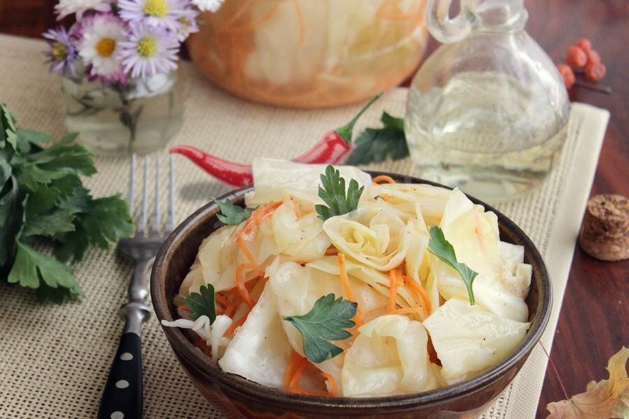 Отличная альтернатива свежим овощным салатам – это капуста Провансаль быстрого приготовления большими кусочками. Когда сезон помидоров с огурцами закончится, можно заготовить такую закуску. Главное преимущество этого рецепта – скорость, ведь попробовать засолку можно уже через 4-5 часов. Ингредиенты: Способ приготовления: Овощи промыть. С кочана снять верхние неприглядные листья, а остальное нашинковать крупными кусочками. Морковку измельчить при помощи терки. Чеснок мелко порубить.Поместить все овощи на дно кастрюли слоями, залить подсолнечным маслом. Воду вскипятить, добавить соль и сахар, специи. Залить уксус. Поместить в маринад смесь овощей. Сверху накрыть крышкой и положить гнет. Выдержать в холодном месте около 4-5 часов. ПРИЯТНОГО АППЕТИТА! Если Вам понравился рецепт, ставьте лайк и подписывайтесь на мой канал в Яндекс.Дзен! А также в комментариях пишите, те продукты с которыми Вы бы хотели видеть рецепты.