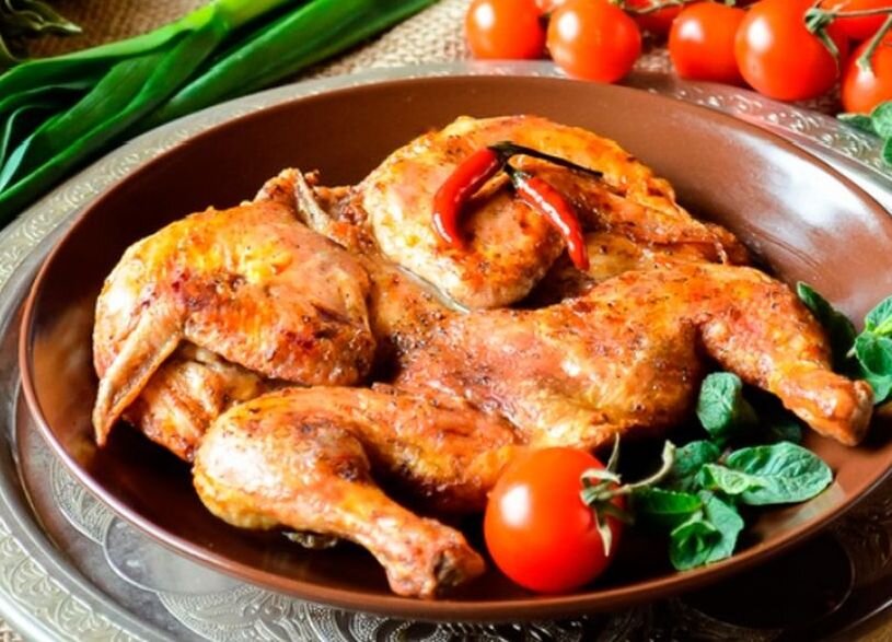 Этот вариант по способу подготовки цыпленка схож с маринованием шашлыка. Для приготовления потребуется тяжелая сковорода с толстым дном и гнет. Это может быть тяжелая плоская крышка. Если ее нет, то можно взять плоское блюдо по размеру сковороды и на него сверху поставить двух или трехлитровую банку с водой. Подготовка 3,5 часа. Приготовление 30 минут. Ингредиенты: Цыпленок весом 400-500 грамм. Половина столовой ложки рубленой кинзы( можно взять чайную ложку сухой). 1 помидор без кожицы(ошпарьте кипятком и она легко снимется). 2 головки сладкого репчатого лука. 2 гвоздики. Черный молотый перец. Масло для жарки. Приготовление: Подавать с лепешками, красным вином и томатным соусом со свежевыжатым чесноком и черным перцем. Приятного аппетита!!! Цыпленок табака. Грузинский вариант. Цыпленок табака в луковом маринаде. Цыпленок табака с чесноком.