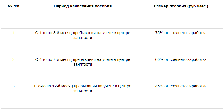 Пособие по безработице выплачивается в следующем размере: