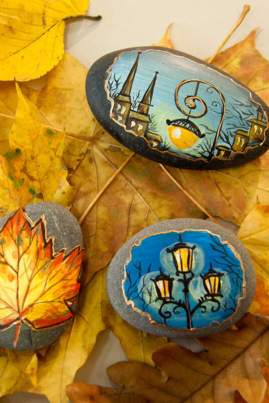 Осень незаметно пришла в город, да так и осталась в нем. Запуталась платьем в ветках клена, зацепила рукавами фонари и они закачались в такт листопаду. Свои следы осень оставляет на камнях. Давайте попробуем увидеть их. А нам на память останется чудесный сувенир, расписанный акрилом камешек, который будет замечательным подарком или просто украсит интерьер. Для росписи камней акриловыми красками нам потребуются осенние листья, городские фонари, серебристо-серое питерское небо. А ещё: • акриловые краски «Таир»; • кисти; • золотой контур «Таир»; • и гладкие камни, на которые ещё не ступала нога осени. Обводим область для росписи карандашом или фломастером. Лучше сделать ее неровной, стилизуя под фреску, оставляя свободу и легкость. Под кленовый лист сделать основу строго в форме самого листочка.