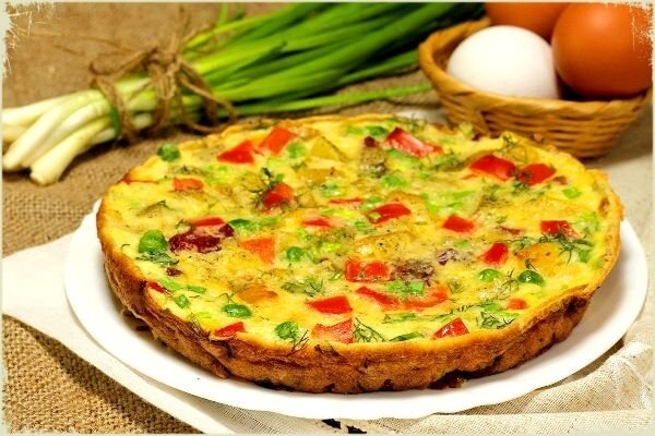 Классическая испанская тортилья готовится с картофелем, яйцами и овощами, мы взяли за основу классический рецепт и добавили копченую колбасу, которая придаст классическому блюду новый вкус. Необходимые продукты: 3 куриных яйца (если яйца крупные можно два), копченная колбаса 150 грамм, 1-2 шт. картофеля, 1 помидор, 1 репчатый лук, 2 ст.л. зеленого горошка свежего или замороженного, зеленый лук, укроп и петрушка по несколько веточек, растительное масло для жарки, соль и черный перец по вкусу. Начинаем готовить. Картофель моем и отвариваем в мундирах. Зеленый горошек заливаем кипятком на 1 минуту, после сливаем горячую воду и заливаем холодной, оставляем горошек до полного остывания, так горошек сохранит свой яркий зеленый цвет. Сваренный в мундирах картофель очищаем от кожуры, нарезаем кубиками и обжариваем на сковороде на растительном масле, до золотистого цвета, картофель выкладываем на тарелку застеленной бумажным полотенцем. На том же масле, на котором жарился картофель, обжариваем