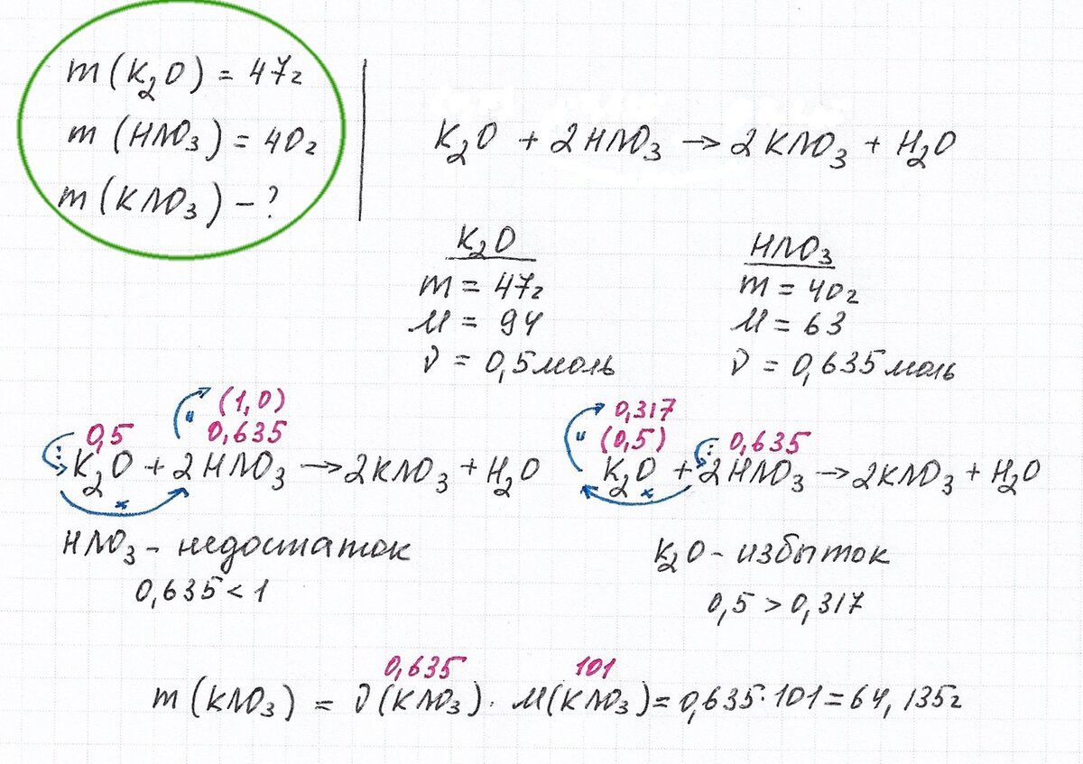 1) Считаем количество вещества азотной кислоты по количеству вещества оксида калия (обычный расчет по уравнению реакции). Читайте внимательно! Я мысленно произношу: "Пусть весь оксид калия вступил в реакцию. Сколько тогда прореагирует азотной кислоты?" И делаю расчет по уравнению реакции. Азотной кислоты, по расчетам, требуется больше, чем дано, значит, азотная кислота - в недостатке.