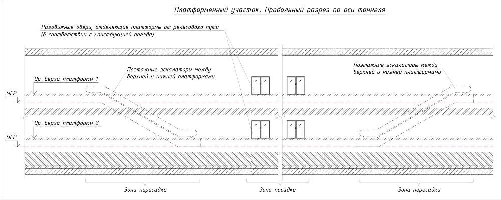 Минимальный внутренний диаметр тоннеля составляет 13.0 м, что обеспечивает размещение двух путей с посадочными платформами, располагаемыми друг над другом, а также всех необходимых технических и технологических помещений и оборотных тупиков с одним путем. При этом посадочные платформы будут иметь ширину около 5 метров в свету (в зависимости от необходимости размещения сбоку от платформы инженерных коммуникаций и элементов интерьера), что соответствует требованиям СП 120.13330.2012 «Метрополитены»: ширина боковой платформы должна составлять не менее 4.0 м. Длина посадочной части платформы должна не менее чем на 8 м превышать расчетную длину поезда в перспективе.