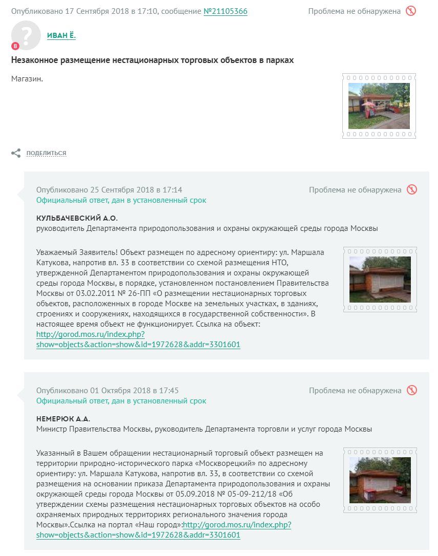Мосприрода и Департамент природопользования раскрылись в парном танце - одни написали чушь, вторые ее повторили, не поленившись съездить на место и сделать фотографию, но не справившись с задачей ПРОЧЕСТЬ написанной на ими же прикрепленной к ответу страничке. А вот, что написано по ими предоставленной ссылочке: Срок действия договора - завершен. И вроде бы можно было сказать, что Мосприрлда мне написала "В настоящее время объект не функционирует.", но мы же видим, что в ответе Мосприроды холодильников для мороженного нет, а на фото в ответе ДпИООСа - холодильники опять есть. Наверняка их просто так поставили возле нефункционируеющего объекта. На самом деле все было не так - Мосприрода заранее предупредила, когда придут фотографировать, и холодильники убрали, а ДПиООС пришел не предупредив. поэтому просто закрыли ставни, а холодильники - оставили. Палятся на мелочах... Ну и больше всего меня порадовала техподдержка "Нашего города", которая посоветовала дождаться ответа ДПиООСа, а когд