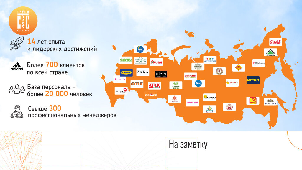 С 2004 года «СТС Групп» организует труд мобильных и вахтовых бригад для обслуживания складских, торговых и производственных процессов организаций различного профиля. Для сопровождения бизнес-процессов клиента мы привлекаем к работе персонал различных специальностей. Если Вы хотите получить работу в Москве, Санкт-Петербурге или других городах России на объектах «СТС Групп», Вы можете обращаться в кадровые центры – к нашему партнеру «Национальному центру занятости» (НЦЗ) www.natjob.ru. На выбор предлагаются различные вакансии, в том числе не требующие спецподготовки. Для кандидатов без опыта работы проводятся бесплатное обучение и стажировка с последующим трудоустройством. Трудоустройство бесплатное. www.stsgr.ru