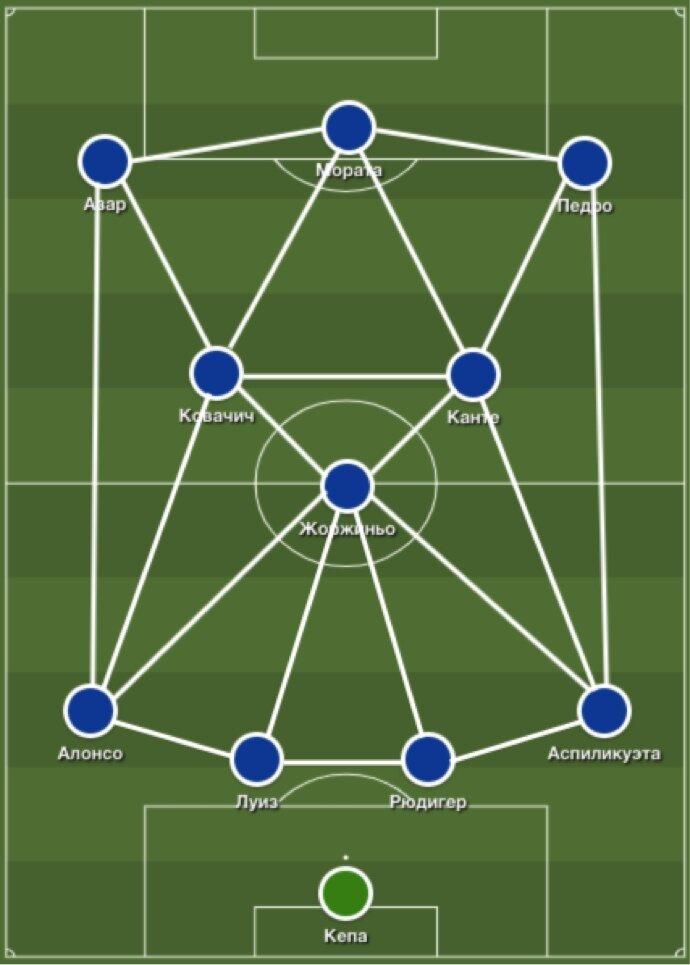 Так располагаются игроки «Челси» в позиционной атаке, где под каждого игрока будут открываться один или два, а иногда даже и три партнера.