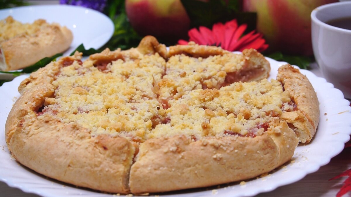 Яблочная галета с крошкой. (Яблочный пирог) В ней много сочной начинки, которая прекрасно сочетается с хрустящим и рассыпчатым песочным тестом. Этот пирог у меня дежурный, часто его готовлю и всегда съедается. Удобный вариант к чаю на все случаи жизни.