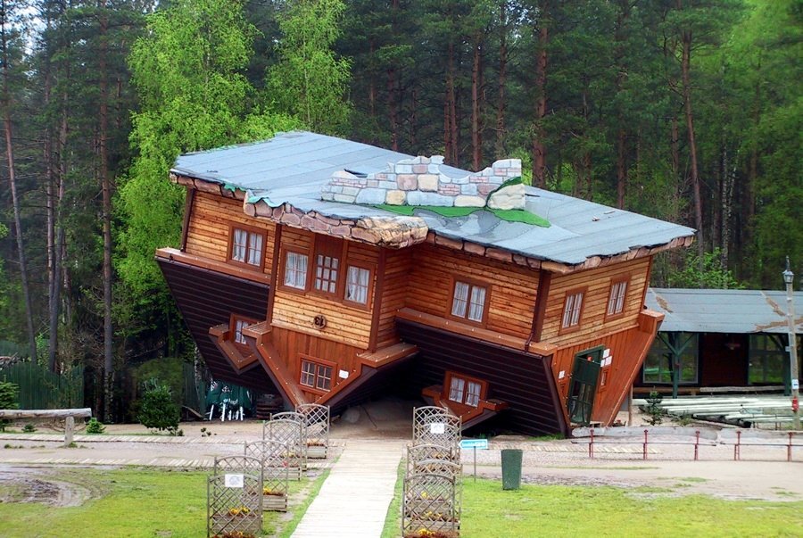 Помните начало самого новогоднего советского фильма? Да, ту самую "Иронию судьбы". Как конструктору старательно обрезали крылья, превратив шедевр архитектуры в унылую бетонную коробку без лица. Времена изменились, и люди стремятся к индивидуальности. Особенно это прослеживается в строительстве частных домов. Каждый ищет интересный проект, не похожий на остальные. И в поисках самого оригинального решения некоторые создают вот такие шедевры. 1. Дом-перевертыш (Польша) Этот необычный домик, стоящий на крыше вопреки всем законам гравитации, можно найти в Шимбарке (40 км от Гданьска). Создал сей шедевр - архитектор и бизнесмен Даниель Чапевски. Своим творчеством он на самом деле олицетворил эпоху коммунизма, которая ворвалась в наши головы и перевернула всё вверх дном. Но об этом мало кто из туристов догадывается. Хотя именно дом-перевертыш и привлекает в маленькую польскую деревушку огромное количество любопытных посетителей из разных стран. К слову, подобные дома-перевертыши есть во многи