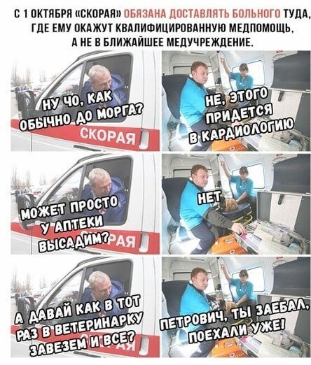 С 1 октября министерство здрвозахоронения России, ввело новые правила для госпитализации пациентов "скорой" медицинской помощи. Теперь, согласно новым правилам, пациента будут госпитализировать не в ближайшее медицинское учреждение, а в ту больницу, где ему могут обеспечить профильную помощь. Такое новое правило вызвало много смеха у работников "скорой" помощи. Ну кто придумывает эти правила? Тот кто думает, что мы везем мужиков с панкреатитом в гинекологию? Потому как и раньше возили туда куда надо. Если травма - то в травмпункт, если инфаркт - то в кардио диспансер/центр, если инсульт то в сосудистый центр, а если аппендицит то в хирургию и в обычную, а не микро хирургию глаза. Бывали конечно случаи, ну лично в моей практике, когда в ближайшую больницу я завозил тяжелых пострадавших с ДТП, но и эта больница была с реанимацией и соответствующими специалистами. Но были и случаи. когда тяжелого больного с инсультом невозможно довезти до сосудистого и тогда выручала ближайшая больниц