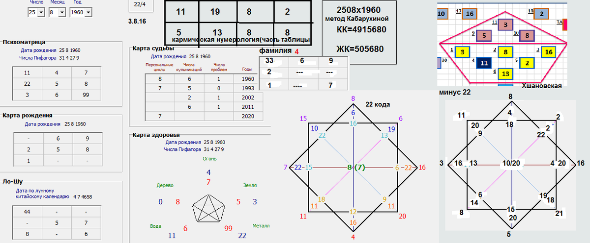 Когда-то я начинала с классической нумерологии, потом мне стала интересна Психоматрица Пифагора и Александрова. Затем пришло время Матрицы Ладини. Методика А. Хшановской повергла меня в шок своей достоверностью. Тогда я решила соединить Матрицу Ладини и методику Хшановской в одну Матрицу про принципу Минус 22. И, похоже, что до меня этого не сделал никто. Вы можете посмотреть мой канал